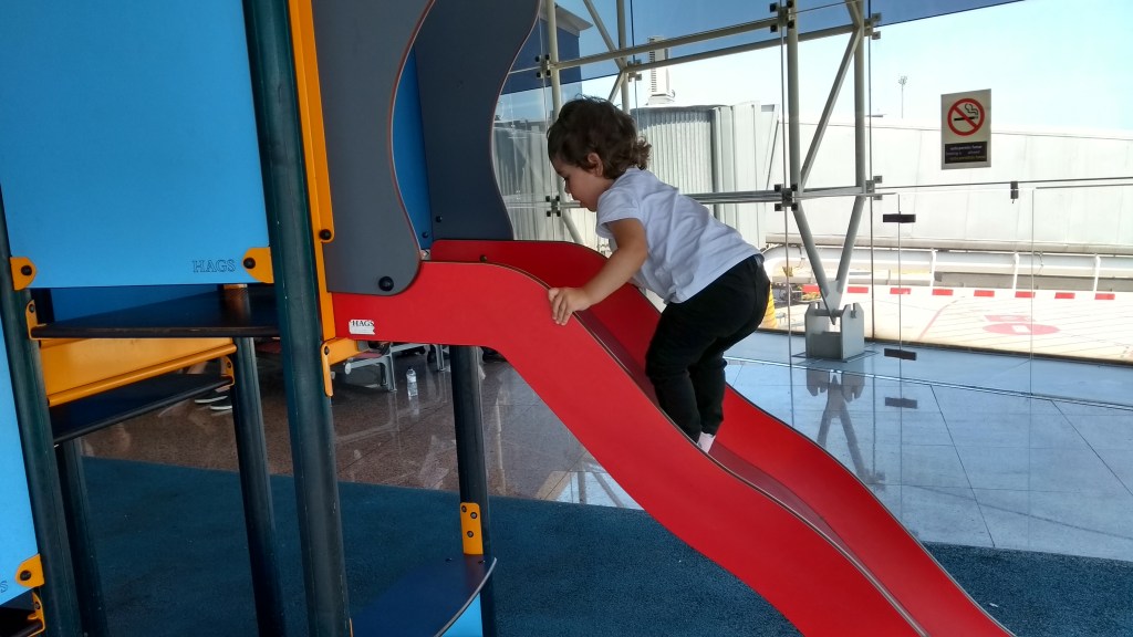 *Aeropuerto del Prat. Hay ascensores al lado de las escaleras mecánicas y lo que más me gusto es que en la terminal hay un control familiar y tiene acceso sin filas. Nosotros cuando llegamos había poca gente, pero las familias tienen prioridad. Pasamos sin problemas; medicamentos, yogures bebidos, potitos y botella de agua (nos dijeron que la tenían que analizar, se la llevaron un momento y nos la devolvieron en seguida). Cerca de las puertas de embarque hay una mini zona de juegos que está muy bien para que los peques se muevan antes del vuelo, a nuestra princesa le encanto. Y pudimos llevar el carro hasta la puerta de embarque del avión donde una azafata se encargo de dejarlo en bodegas.