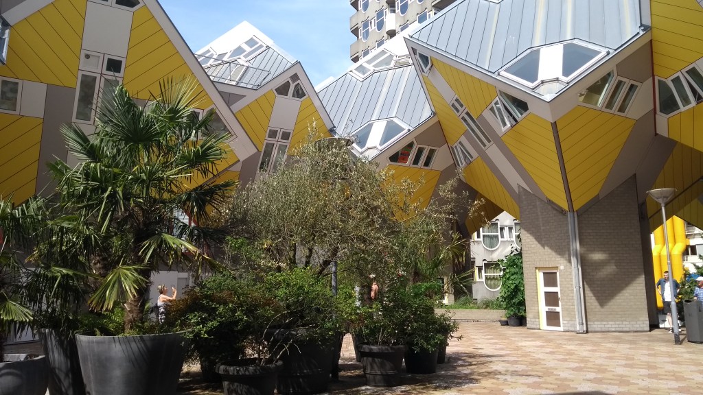 Nos levantamos pronto y nos preparamos enseguida. Desayunamos con cositas que habíamos traído (ya que el hotel no dispone de servicio de desayuno) y nos dirigimos hacia Kijk-Kubus, Laurenskerk y Rotterdam´s Market Hall. Inicialmente pensábamos ir en metro… pero decidimos ir andando ya que esta todo más o menos cerca y muy bien señalizado, te vas encontrado por la calle carteles donde están indicado los sitios más turísticos de la ciudad. De camino a Laurenskerk que es la iglesia medieval protestant mas antigua de Europa pasamos por un centro comercial (donde descubrimos Hema, que es una tienda muy chula), por el Worl trade center de Rotterdam y por una zona de canales. Se puede acceder a la iglesia y vale 2€ cada adulto, los niños gratis, pero decidimos seguir nuestro tour hacia Rotterdam´s Market Hall, que nos dejo alucinados, por mucho que veas fotos, nunca reflejan la verdadera belleza del lugar. Después de verlo tanto por afuera como por adentro, nos pusimos rumbo a Kijk-Kubus o las casas cubo y vimos nuestro primer parking de bicis que nos llamo mucho la atención. Para acceder a las casas cubo con el carro hay unas rampas “que tienes que buscar” pero se puede subir sin usar las escaleras. Las casas cubo están todas habitadas, de hecho en una de ellas hay alojado un albergue, pero han dejado una de exposición que se puede visitar. El precio es de 3€ y es bastante curiosa. A mí personalmente me gusto mucho, eso sí, hicimos la visita por separado ya que nuestro peque se quedo dormida justo antes de entrar y para acceder solo hay unas escaleras que no te puedes cruzar 2, así que peor aun subir con un carro.