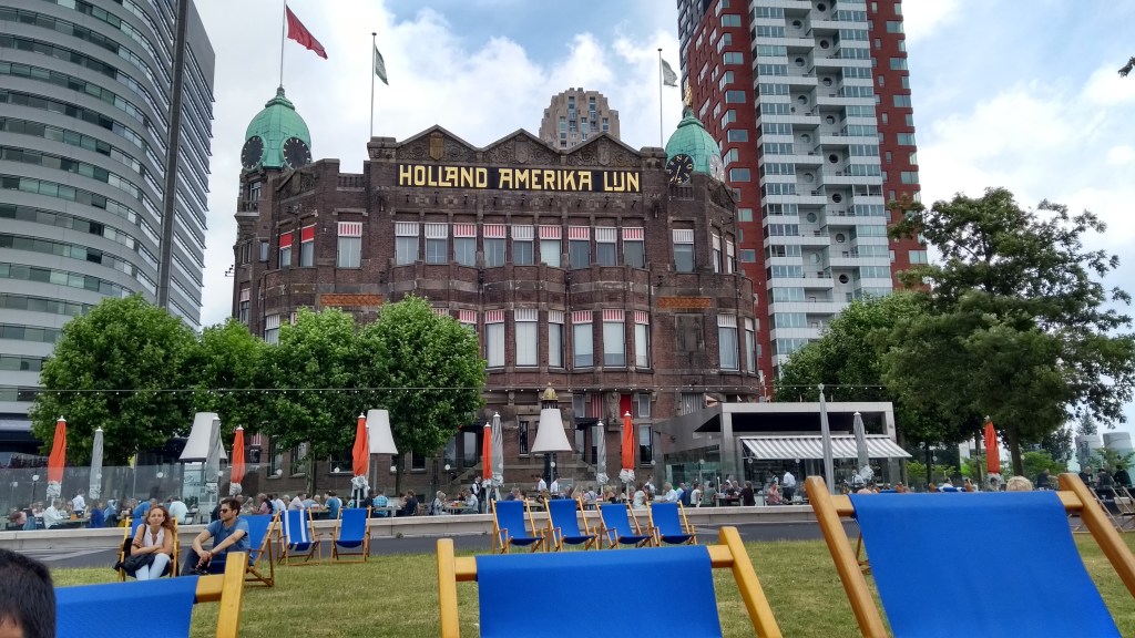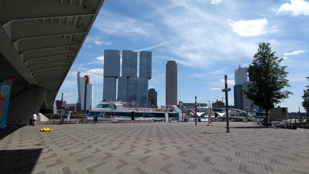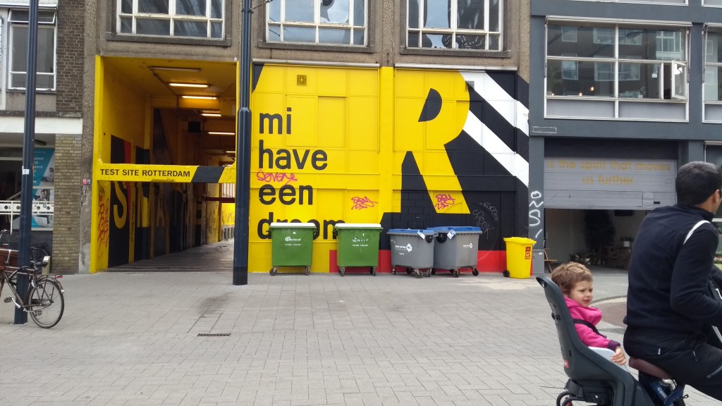 Debido al tiempo hemos hecho algún cambio de planning. Hoy hemos decidió coger la bici y hacer una ruta por el arte callejero de la ciudad. Lo primero de todo hemos subido paseando hasta la estación central (10 minutos), que es símbolo de la reconstrucción de Rotterdam y al lado hemos encontrado una tienda donde alquilan bicis y sillitas para bebes que se llama Rzwaanbikes. Hay muchas tiendas de alquiler de bicis, pero no en todas tienen sillitas. El tour empieza en la estación y se puede hacer por libre o contratar un tour (sábados y domingos de 12:00 a 15:00 por 15€/persona). Hemos disfrutado mucho del paseo, tanto que la pequeña se nos ha quedado dormida… así que hemos decidió ir a las hamacas que hay delante del Hotel New York y disfrutar de las vistas mientras reponemos fuerzas.