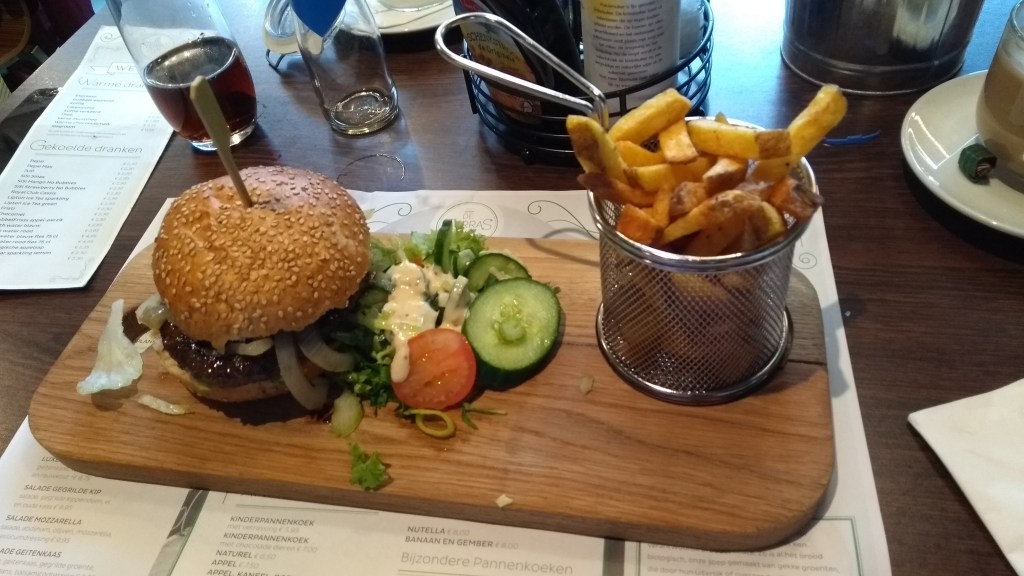 Nos levantamos, desayunamos y fuimos a dar de comer a los patos antes de marchar hacia Amersfort. En teoría es una ciudad muy bonita, pero lo poco que vinos nosotros fue un poco más de lo mismo, lo que sí que nos llamo mucho la atención y es una pasada, la puerta medieval que conservan, es impresionante. Por la tarde decidimos para a ver el castillo de Haar y lastima no haber dedicado todo el día a este castillos. Nada más llegar, nos dijeron que no nos iba a dar tiempo de entrar en el castillo porque era muy grande, pero si queríamos sí que podíamos pasear por los jardines. Y así que eso hicimos. Nos gusto un montón y a la vez nos dio mucha pena el no haber podido disfrutar más de él. Puedes pegarte horas paseando, hay muchos caminos dentro de los jardines y en uno de ellos nos encontramos unos ciervos. Cuando cerro, nos dirigimos al último B&B. Después de estar unos días conducción en este país hemos llegado a la conclusión de que las carreteras son una pasada, sobre todo las principales, tienes 4 o 5 carriles en muchos casos y en los accesos a las ciudades suele haber mucho tráfico, pero supongo que como en todos sitios, dependerá de la ciudad y las horas que las cruces. A su vez, las carreteras secundarias son bastante más tranquilas. Una vez llegamos al pueblo de Maasland, hicimos el check in en el B&B que lleva el mismo nombre y le preguntamos a la señora que lo regenta alguna recomendación para cenar. Casualidades de los viajes, los lunes suele ser un día donde muchos negocios locales hacen el descanso semanal, pero por suerte nos recomendó un bar/restaurante, que si que habrían los lunes de comida típica. El camarero era muy peculiar pero súper majo, el sitio se llamaba Brasserie De Afrit y cenamos pollo y costillas, pero con salsas indonesias, ya que nos dijo que tenían mucha comida procedente de ahí. Cuando acabamos nuestra deliciosa cena, volvimos al B&B para reorganizar maletas e ir preparando la vuelta, ya que mañana es el último día por estas tierras.