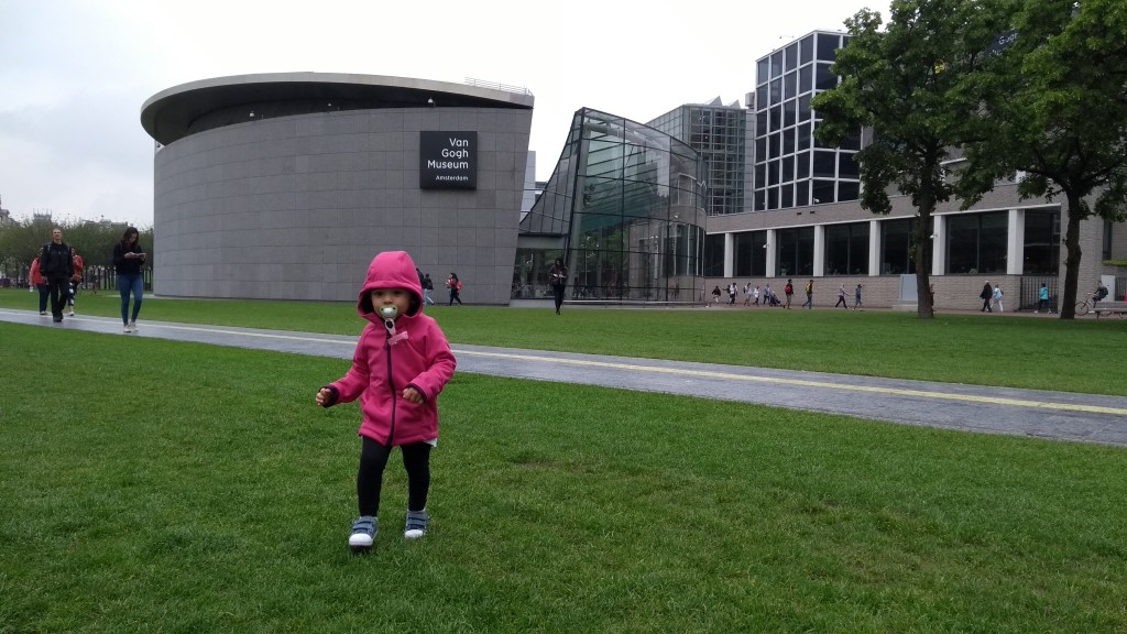 Al día de hoy le tenía muchas ganas… Vamos a ir al museo de Van Gogh y a seguir disfrutando de la ciudad. El día empezó con un poco de retraso, estamos tan bien en el B&B que cuesta arrancar, sobre todo la peque ya que viven niños ahí y le han dejado sus juguetes. Llegamos sin problema al museo y como sacamos la entrada on line, nos hemos evitado una gran cola y además como íbamos con el carro la gente que trabajaba en el museo súper amable nos iban abriendo todas las puertas. En museo en sí tanto el edificio como la exposición, nos gusto mucho está todo muy bien explicado. Tuvimos la suerte de que nuestra princesa se hecho una mini siesta y nosotros pudimos disfrutar más tranquilamente de la explosión. Al salir del museo hemos comido en el parque Museumplein Park. Es un parque tranquilo pero animado, donde también hay una zona infantil y una pistas de skate, se encuentra justo a la salida del museo y a través de él se llega a la entrada del Rijks muesum el cual tiene la famosa frase de I LOVE AMSTERDAM para hacerte unas fotos… eso sí, lleno de gente como era de esperar y más a medio día Después de comer nos hemos acercado a otro mercado que nos recomendaron nuestro Italianos de B&B que se llama Albert cuyp markt (Heerlijk Amsterdams), al no ser tan turístico no había tanta gente y nos ha gustado mucho, hasta hemos comprado alguna cosita… Para finalizar el día, como hemos tenido a la peque mucho rato en la silla, hemos ido a jugar a otro parque con un súper arenero, columpios, toboganes y muchos niños… al volver a casa hemos cogido otra vez el tranvía y creo que no lo había mencionado antes pero aquí en los Países Bajos tienes que picar la tarjeta tanto al subir como al bajar. Al llegar al B&B estaban los niños de la casa y hemos estado jugando con ellos, la verdad que estuvimos súper a gusto con ellos, y aprovechamos el rato de juegos de los niños para preguntar un poco cositas de ahí, tema coles, conciliación, etc.