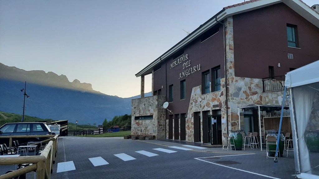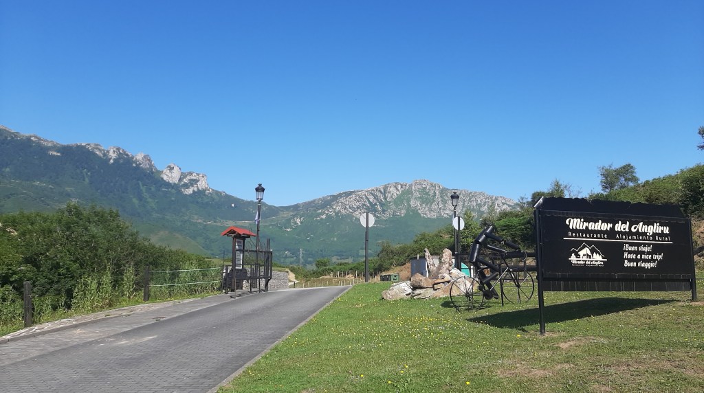 Hoy nos hemos despertado en el mirador del Angliru. Papi bicicletero quería subir el puerto y decidimos hacer noche aquí. Por 5€ puedes dormir en el parking y por 5€ más tienes opción de llenado y vaciado de aguas.
