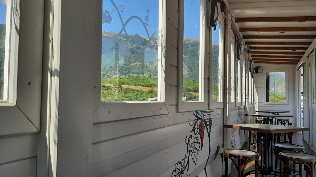 Nos hemos levantado y mientras esperábamos, hemos tomado un café y unos zumos de naranja recién exprimidor en la terraza del bar del albergue. Cuando hemos acabado nos han puesto un hinchable que tiene para los peques ¡sólo para nosotros!