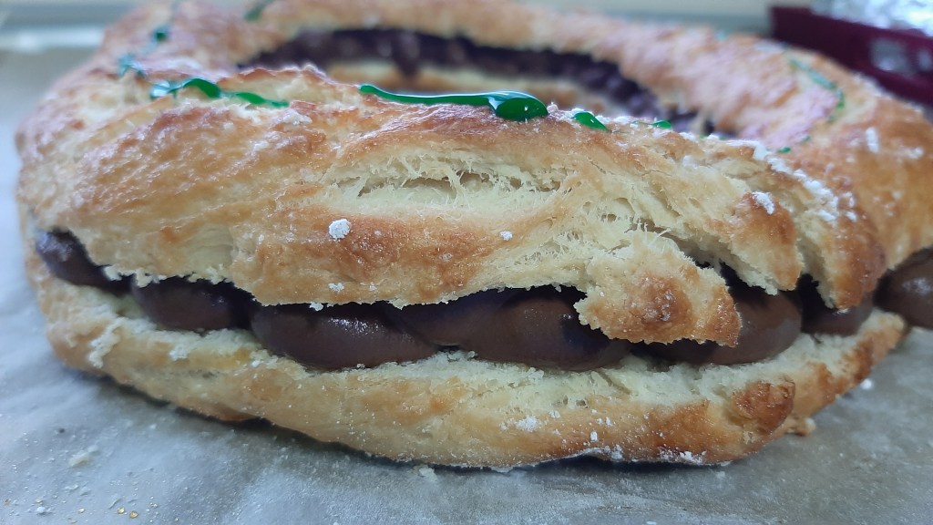 Después de toda la mañana de sorpresas y juegos toca reponer energía. Hay que comer y para postre no puede faltar el roscón de Reyes… el cual también tiene su gracia. Es una especie de bizcocho relleno de nata (crema o chocolate) con forma de roscón en el cual te puede tocar 1 ó 2 sorpresas en su interior. La primera es opcional que es una figurita pequeña aleatoria la cual significa que tendrás suerte… y la segunda es una figura de un haba, que si te toca, te toca pagar el roscón…